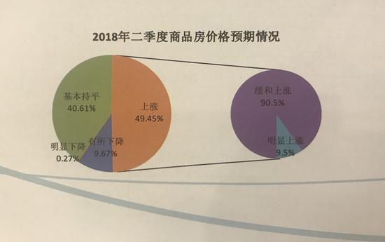 报告指出,与2018年一季度相比,预计二季度商品房价格总体上涨的179人,占比49.45%,这当中预计明显上涨的只有17人;预计总体价格基本持平的147人,占比40.61%;预计总体价格有所下降的35人,占比9.67%,其中仅1人预测明显下降。
