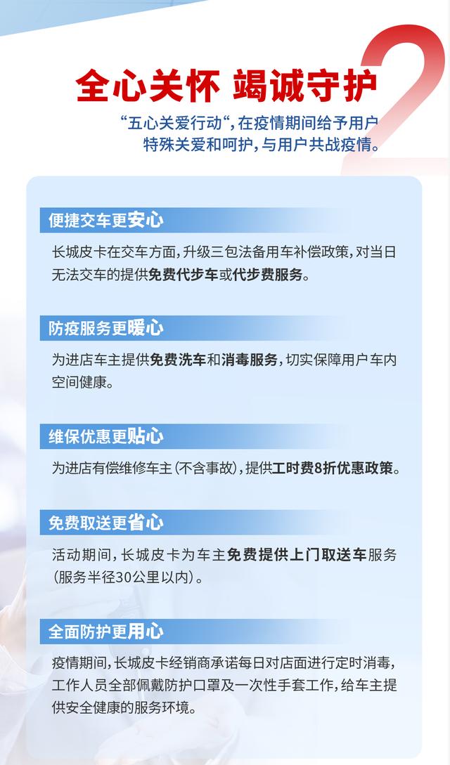 对于在疫情期间仍有进店、提车需求的用户,长城皮卡推出“五心关爱行动”,在疫情期间给予用户特殊关爱和呵护,与用户共战疫情。