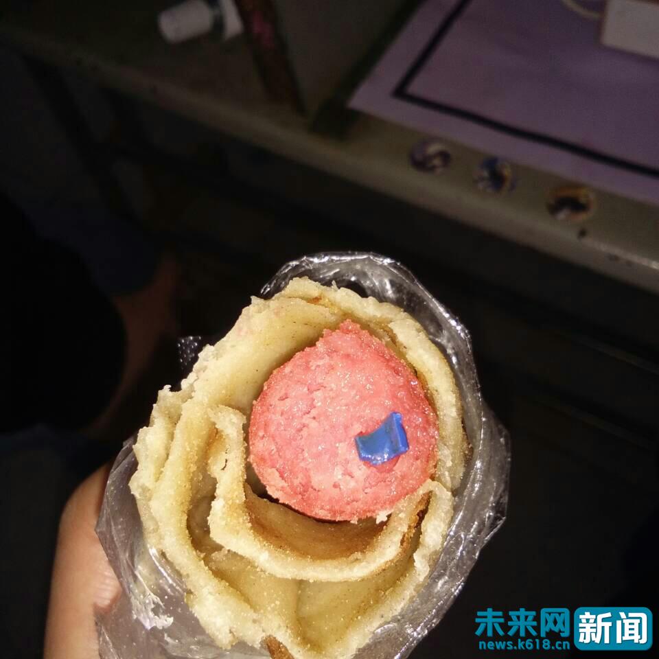 有学生在学校食堂购买的烤肠中发现橡胶皮。 受访者 供图强制学生校内就餐,编排值班表禁止外卖进校