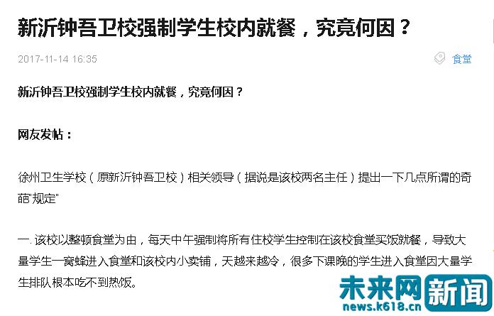 2017年11月份网上发布的关于徐州卫生学校强制学生校内就餐文章该学生无奈的表示,食堂没得救,有同学甚至表示“求学校放过”。