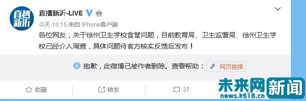 受访者提供有同学晒出学校食品问题相关报道后该校任校长回复记者找到爆料徐州卫生学校食堂卫生存在问题的微博,发现该微博已被作者删除,取而代之的是,一篇新的微博,该微博表示,“关于徐州卫生学校食堂问题,目前教育局、卫生监督局、徐州卫生学校已经介入调查。”
