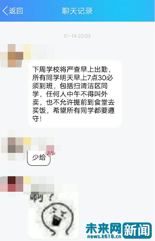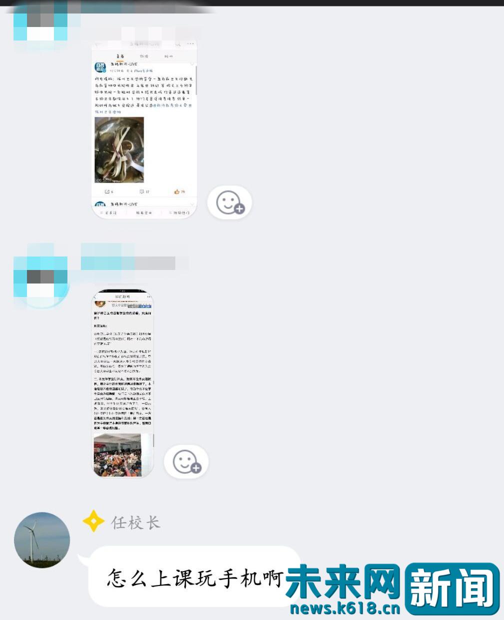 食堂卫生问题被曝光后,受访学生告诉记者有人在学校群中贴出了相关报道的截图,而该学校的任校长随后回复该同学“怎么上课玩手机啊”,对此,受访学生表示并不理解校长关注的重点在哪里。