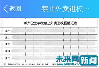 徐州卫生学校禁止外卖进校园值班表 受访者 供图一名学生告诉记者,从2017年开学后的一段时间后,学校就不让学生中午出门吃饭。该学生称由于学校中午不让外出就餐,导致了食堂人多且异常拥挤,所以只能去商店买泡面零食。