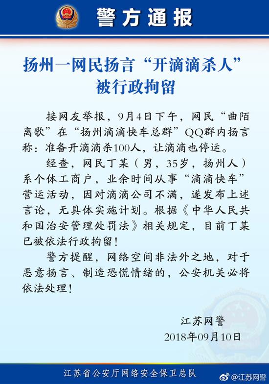 扬州一从事快车运营男子因不满扬言“开滴滴杀人” 已被行拘