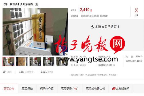 贵州茅台酒一瓶,评估价1500元,起拍价1050元,被围观3564次,138人设置提醒,19人报名参与竞买,9位买家角逐竞拍。经过40次出价、25次延时,最终以2410元成功拍出,溢价率高达129.52%!