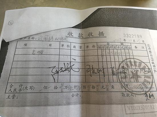 数额较大的一笔是,2017年1月25日,购买香烟花了将近3.6万元,收款方盖章为张家港市凤凰镇港口夏氏商行。