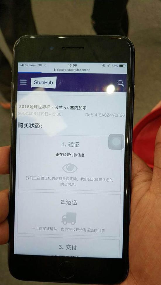 重庆球迷通过STUBHUB网站购票,却始终停留在付款审核页面。另外,来到俄罗斯之前,记者加入了一个世界杯球票的微信交流群,里面很多人都在求购或者转让门票。这两天,也出现了一些和球票有关的争议。一位名叫“冷蓝山”的网友在群里表示,他从别人手中以210美元买了一张球票,过了两天,卖他球票的人表示,之前卖给他的价格太低了,要求他重新补上500美元,否则这位卖家就会去票务中心以主申请人的身份重新打印球票。这样一来,“冷蓝山”手上的这张票就会作废。至于这个说法是否成立,尚不得而知。