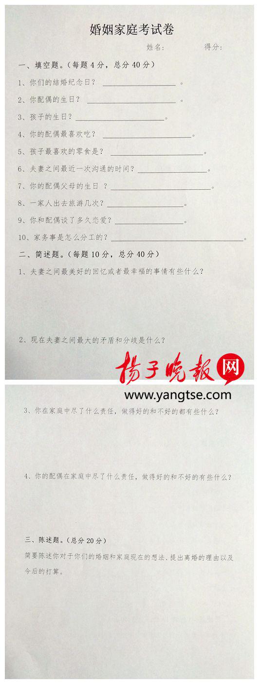 那试卷到底是什么样子?为此,该局拿出一份在5月19日尝试推出的《婚姻家庭考试卷》,总分为100分,分为填空、简述和综述三类题型,内容涉及家庭成员生日,夫妻间的矛盾分歧、最幸福的回忆等。此外,在综述题中,对答体者还提出自己对婚姻和家庭的看法,并简述离婚理由及今后打算。
