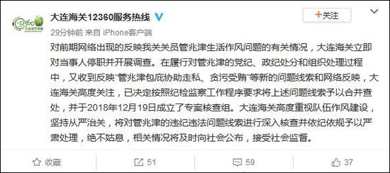 消息指出,在履行对管兆津的党纪、政纪处分和组织处理过程中,又收到反映“管兆津包庇协助走私、贪污受贿”等新的问题线索和网络反映,大连海关高度关注,已决定按照纪检监察工作程序要求将上述问题线索予以合并查处,并于2018年12月19日成立了专案核查组。