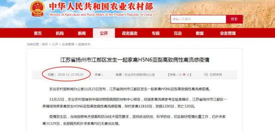 农业农村部网站疫情发布截图据悉,11月22日,农业农村部接到中国动物疫病预防控制中心报告,经国家禽流感参考实验室确诊,江苏省扬州市江都区一养殖场饲养家禽发生H5N6亚型高致病性禽流感疫情,存栏家禽11810羽,发病1200羽,死亡320羽。