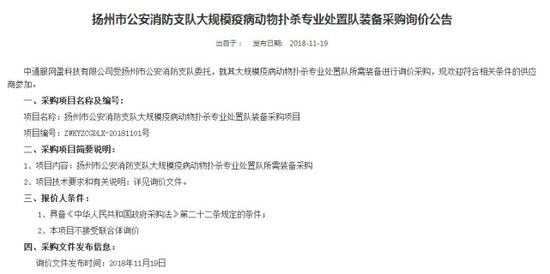 图文无关11月19日,扬州公安消防支队发采购询价公告,购买大规模疫病动物扑杀装备。