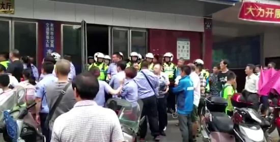 从网上流传的视频看,在写有“交通警察”字样的楼门口,身穿蓝色制服的综合行政执法局人员,与戴着头盔、身着交警服装的人员形成对峙,双方共有数十人,引发市民围观。