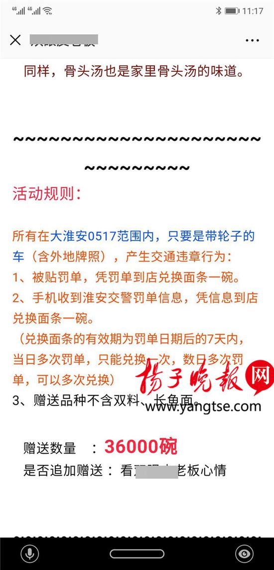 看完电影,发现自己车子被交警贴了罚单,心里不爽的陆某想起了《西虹市首富》王多鱼撒钱招数“脂肪险”,任何人每廋一斤给1000元。右脑比较活络的他想到为自己新开的面条馆做个营销:为在淮安产生违法交通行为的车主“买单”。25日,他在自己的微信公众号上发布自己面馆的营销信息:“你们被贴罚单,我请你们吃面。”而且还煞有其事地公布了活动规则:“只要在淮安境内产生违法交通行为的,凭借罚单或手机收到的罚单信息,均可到他所开的面馆兑换面条一碗。”并在其微信朋友圈进行转发。