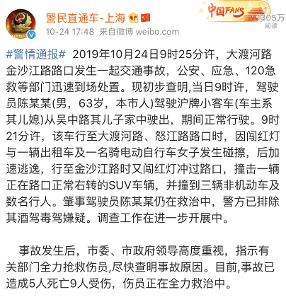 上海市公安局通过官方微博发布通报称,10月24日9时25分许,大渡河路金沙江路路口发生一起交通事故,公安、应急、120急救等部门迅速到场处置。现初步查明,当日9时许,驾驶员陈某某(男,63岁,本市人)驾驶沪牌小客车(车主系其儿媳)从吴中路其儿子家中驶出,期间正常行驶。9时21分许,该车行至大渡河路、怒江路路口时,因闯红灯与一辆出租车及一名骑电动自行车女子发生碰擦,后加速逃逸,行至金沙江路时又闯红灯冲过路口,撞击一辆正在路口正常右转的SUV车辆,并撞到三辆非机动车及数名行人。肇事驾驶员陈某某仍在救治中,警方已排除其酒驾毒驾嫌疑。调查工作在进一步开展中。目前,事故已造成5人死亡9人受伤,伤员正在全力救治中。