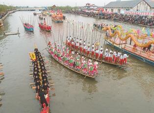 5日上午9点多,具有近千年历史的兴化市戴南镇刁家村中心河上,4000多名来自戴南等地的农民,有男有女,扎着各色头巾,用竹篙和木桨将150条船推向前方,赢得两岸近万观众阵阵欢呼。