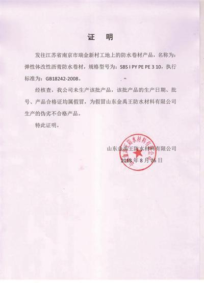8月26日下午,山东金禹王防水材料公司正式向记者发来了证明,声称该公司未生产该批产品,该批产品的生产日期、批号、产品合格证均属假冒,为假冒该公司生产的伪劣不合格产品。