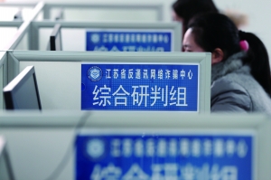 1月19日上午,现代快报记者来到江苏省反通讯网络诈骗中心,只见警方、银行、运营商在各自的席位上各就各位,正紧张而有序地忙碌着。键盘声、打印机的吱吱声,还有不时响起的指挥调度声,给人一种踏实的感觉。