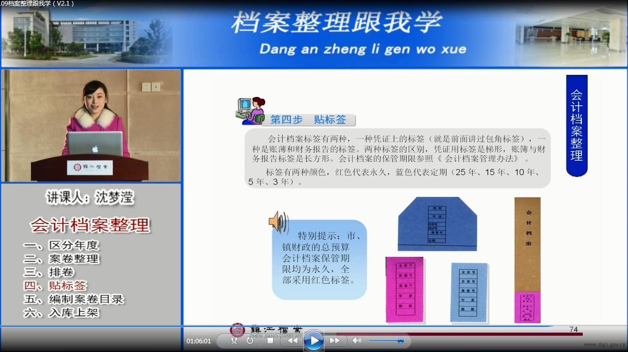 早在2008年,镇江市档案局即已制作《五种档案整理跟我学》幻灯片,广为传发收到良好效果。2014年11月镇江市档案局又组织人员录制教学视频。该视频针对档案整理实际操作中的重点、难点、易混淆点,图文并茂,通过视频教学的形式,更加生动直观、通俗易懂,具有互动性。视频包括三个主要界面,分别是视频界面,目录界面及幻灯片界面,由四位主讲人视频教学,具体是档案整理综述及文书、科技、会计、实物和照片等五种档案整理,共六个章节近80分钟。新录制的视频,一方面通过文字和声音等视听信息,提供更多的学习内容,形象有效的帮助学习人员记忆。另一方面方便基层档案工作者提高学习兴趣,增加学习的主动性。近日,镇江市档案局借助全市电子政务平台将视频推广普及,进一步提升全市档案管理规范化水平。