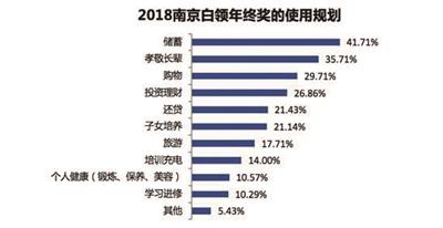 如何使用年终奖, 也是很多人最为关心的话题。智联招聘数据显示,选择存进银行的南京白领最多,高达41.71%,高于2017年的38.1%。其次是用来“孝敬长辈”,占比为35.71%,“购物”则由2017年的第四位上升到今年的第三,占比29.71%。南京作为省会城市,生活在这里的白领的消费水平和生活压力普遍比较大,基于对2019年经济形势的预估,更多的白领会选择将年终奖存进银行来提高自己的抗风险能力。
