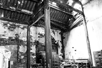 记者看到,李公祠内的大殿如今被用作仓库,里面有啤酒、饮料箱子等。不过,大殿里的雕刻彩画还是很显眼的,比如梁架上有各种精美的雕刻,有龙、凤、麒麟等各种瑞兽的图。只是,现在大殿的屋顶让人担忧。屋顶东侧破了几个大洞,洞口旁边的瓦片似乎随时要掉下来,大殿内部的墙壁也脱落得露出了青砖。