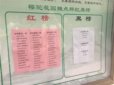 记者了解到,樱驼花园社区每个月都会排出这些摊点群的红黑榜,摊点群的分数来自两方面,自治联盟打分占60%的权重、社区市民打分占40%的权重,当月分值达85分以上的店家会上街道设置的“门前三包”公示橱窗红榜表扬,分值低于70分的店家予以黑榜警示。