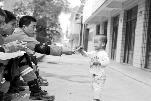 救灾现场,坐在地上端着盒饭的消防队员,伸出右手,把一只鸡腿递给面前的小男孩……