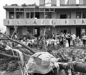 “万一门被吹开了,孩子们会被大风吸走。”为了保护孩子们的安危,6名教师用自己的身体堵住教室大门,护住了班上的孩子。可是有的木门和窗户很快被吹出一个大窟窿,教师们连忙用自己的背部、头部或胸膛堵住窟窿,任凭冰雹和砖石砸在自己身上,一直持续到灾难结束。