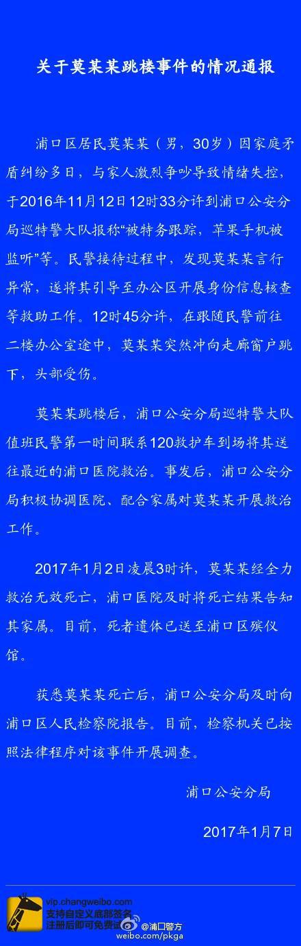 根据南京市浦口区警方官方微博媒体2017年1月7日发布的情况通报显示:30岁的浦口居民小莫因家庭矛盾纠纷多日,与家人激烈争吵导致情绪失控,于2016年11月12日12时33分许到浦口公安分局巡特警大队报称“被特务跟踪,苹果手机被监听”等。民警接待过程中,发现其言行异常,遂将其引导至办公区开展身份信息核查等救助工作。12时45分许,在跟随民警前往二楼办公室途中,小莫突然冲向走廊窗户跳下,头部受伤。
