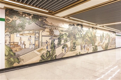 武定门站的“眠芍”,采用进口天然石材马赛克制作,长卷式的表现了薛宝钗和林黛玉谈《牡丹亭》和《西厢记》、刘姥姥进大观园、湘云眠芍等故事。