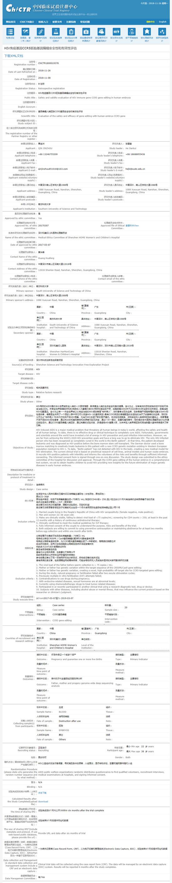 中国临床试验注册中心官网上的《HIV免疫基因CCR5胚胎基因编辑安全性和有效性评估》一份注册信息显示。该项目补注册于2018年11月08日,最近更新于11月26日。研究课题的正式科学名称为“基因编辑人类胚胎CCR5基因安全性和有效性评估”。此前网上流传的《深圳和美妇儿科医院医学伦理委员会审查申请书》正是该项目的伦理委员会批件。