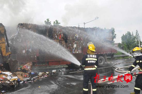 当天上午8时10分左右,一辆车牌为苏G50635大货车满载着废旧纸板由西向东正常行驶,驾驶员孙师傅通过后视镜忽然发现自己车后冒气黑烟,忙下车看个究竟,不好,原来上的货物着火了,而且火势越来越大,孙师傅一边忙着大声呼喊救火,一边拨打“110”和“119”求救。