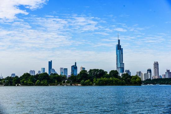 中午,站在河西国际博览中心附近的高楼上眺望:南京的天空湛蓝湛蓝的,蓝丝绒“幕布”上几丝白云安静地呆着,美得像一幅画。在南京眼游玩的人真不少,俯瞰长江,水面上静静映出白云蓝天的倒影;往东边看,紫峰大厦、紫金山一览无余,似乎近在眼前。
