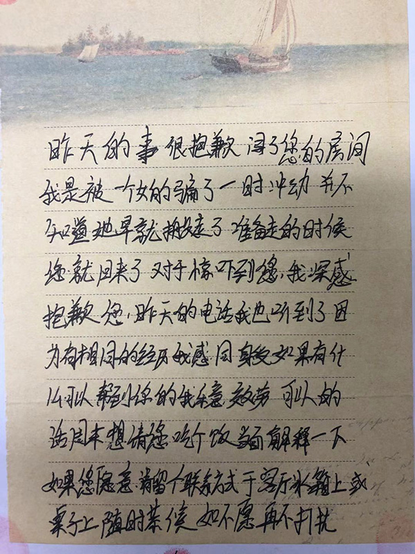 非法入室男子道歉信。 建邺警方供图据建邺警方介绍,入室男子当天下午再来“拜访”李女士,是想向李女士道歉。他原本打算把道歉信从门缝塞进李女士房间,却被逮了正着。