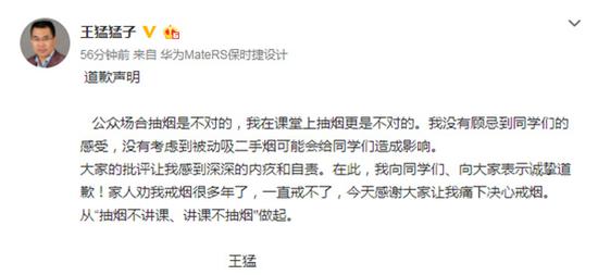 “大家的批评让我感到深深的内疚和自责。在此,我向同学们、向大家表示诚挚道歉!家人劝我戒烟很多年了,一直戒不了,今天感谢大家让我痛下决心戒烟。从‘抽烟不讲课、讲课不抽烟’做起。”@王猛孟子在道歉声明中称。