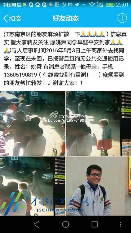 昨天上午,记者从微博获悉:3日上午,南京第一中学的初三学生姚舜在南京秦淮区大光路附近走失,至今没有回家。记者第一时间联系到姚舜的姐姐姚文静,她告诉记者,最新消息有目击人4日晚上看到姚舜在超市里买东西,但目前却没有任何进展,家人寻子心切。