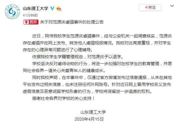 据山东理工大学官方微博消息,山东理工大学发布关于对范源庆虐猫事件的处理公告,称经与公安机关一起调查核实,范源庆存在虐猫并在网上发布、转发他人虐猫视频情况,依据学校学生学籍管理规定,对范源庆予以退学。