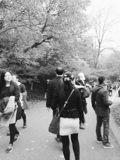 记者粗略数了一下,从上午10点到中午12点,大约有20余名游客对枫叶“下手”,绝大部分都是女性游客,她们把枫叶当成了“天然饰物”,要么插在头发里,要么编成花环顶在头上,还有人直接折下缀满枫叶的枝条拿走。