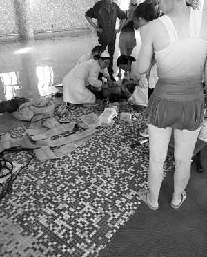 溺水事件发生后,游泳馆救护人员立即采取救护措施。同一时间,一墙之隔的南通市中医院急诊室也派出三人抢救小组,迅速来到泳池边展开救援。据参与救援的一名护士介绍,当他们赶到现场时,童童面部紫灰、口唇紫干,没有心跳和呼吸。医务人员给童童接上抢救仪器,通过长达5分钟的心肺复苏,童童终于恢复了微弱的心跳。因情况紧急,麻醉科医生在半途对童童进行了气管插管,以辅助呼吸。“将孩子安全送至医院后,我们为他接上呼吸机,进行药物治疗,生命体征渐渐恢复,然而他的神志还未清醒。”由于该院没有空余床位,孩子随后被转院送往南通市第一人民医院进行后续治疗。