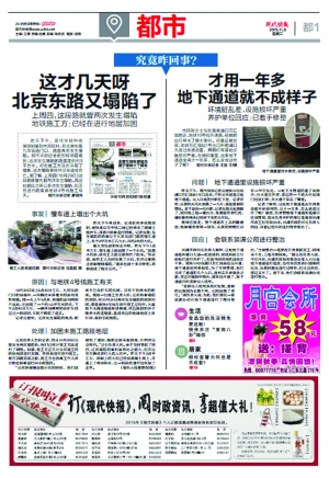 随后,市政、交警等部门也来到现场。“地面下都是空的,他们正在用水泥砂浆往里面灌。”昨天下午,现代快报记者赶到现场时,在建的九华山站南侧道路已经被围挡堵住,工人们正在往地面下的空洞内浇筑水泥砂浆。记者看到,塌陷的路面近3米长、2米宽,道路旁边的人行道上,一棵小树已经歪倒。