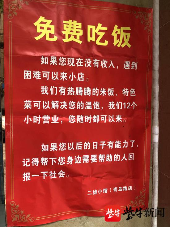 刚刚走近二娃小馆青岛路店,店门口红纸张贴着的“免费吃饭”宣传便映入眼帘:如果您现在没有收入,遇到困难可以来小店。我们有热腾腾的米饭、特色菜可以解决您的温饱,我们12小时营业,您随时都可以来。如果您以后的日子有能力了,记得帮下您身边需要帮助的人,回报一下社会。