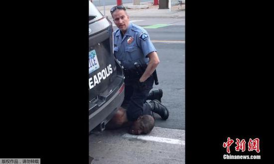 当地时间5月25日,美国明尼苏达州明尼阿波利斯市4名警察在逮捕非裔男子乔治·弗洛伊德时,将其按在地上,其中1人用膝盖顶住脖子,造成弗洛伊德死亡。