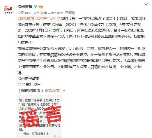 江苏省徐州市政府新闻办官方微博截图据介绍,3月1日,徐州市部分微信群里传播:依据“徐民事〔2020〕1号”和“徐殡改办〔2020〕5号”文件之规定,2020年4月4日(清明节)前后,所有公墓和祭奠场所,禁止一切祭扫活动。即时的安葬事宜不得多于10人!自2月24日起关闭陵园墓地和祭祀场所。特此相互转告。