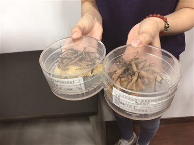 在省食品药品监督检验研究院的中药标本室,工作人员周娟娟向市民展示了正品和伪品的冬虫夏草,令人意外的是,正品冬虫夏草身材“干瘦”,伪品却“个大体肥”,卖相比正品还要好。