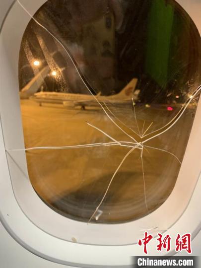 图为被砸破的飞机舷窗内侧玻璃 警方供图据介绍,5月25日晚,河南省公安厅机场公安局接到警情,“一名醉酒女性旅客在飞机飞行途中将舷窗玻璃破坏,严重影响飞行安全,该航班将备降郑州新郑国际机场。”接到指令后,郑州机场警方迅速赶往现场了解情况,并成功将涉事女子控制。