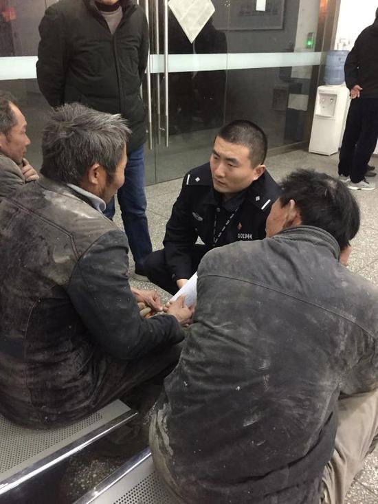 朱扣华说,当时,三名农名工师傅身上都有些伤,坐在派出所处警大厅的椅子上,“你一言我一语说不清楚”,“我索性就蹲下来听他们慢慢讲”,没想到这个普通的举动,居然被拍下还发到了朋友圈。