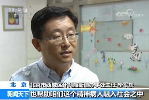 北京市西城区什刹海街道办事处主任 毕军东:康复日间照料站,一个是给稳定的精神病人创造一个相互沟通、相互交流的平台,同时我们请专业机构参与到康复项目中来,也帮助精神病人融入社会之中,采取一些好的各种形式的活动。