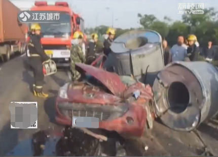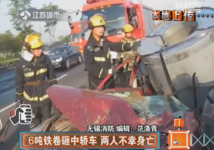5月10日上午6点多钟,无锡江阴市祝塘镇境内,一辆装运铁皮卷的大挂车失控冲向逆向车道,铁皮卷砸中一辆小轿车,造成车内两人被困,公安消防人员立即赶赴现场救援。