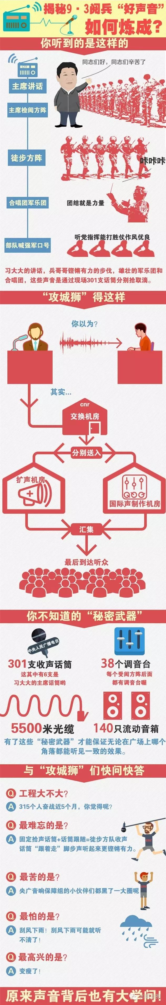 编者按 天涯共此时,今天“9·3大阅兵”圆满结束。现场几万人齐唱国歌,升旗手高扬五星红旗,三军仪仗队正步走过长安街,老兵颤抖却坚毅地敬礼、激动地洒泪……这些画面汇成了亿万中华儿女共同的记忆。在震撼、感动的同时,你是否想过,现场铿锵有力的正步声是如何收集的?仪仗队为什么从人民英雄纪念碑迈出第一步?7万只气球是如何充气放飞的?各国领导人阅兵后的午饭菜单是什么?光明微信为您一一解答!“好声音”是如何炼成的?