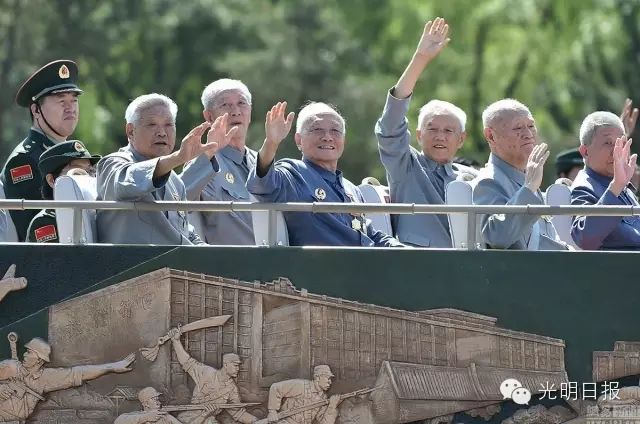 抗战老兵乘车方队经过主席台激动地挥手。