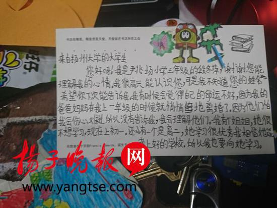 孩子们写给哥哥姐姐的信“我有时候会觉得自己的命运不好,因为我的爸爸妈妈在我上一年级的时候就悄悄地离婚了。他们没有告诉我,我会理解他们。我会好好学习,考到你们学校找你玩,和你玩一整天。”这是扬州大学社会发展学院社工专业的周嘉豪收到的信,这个大男孩悄悄抹了眼泪,立刻提笔回信:“我们约好了在这里等你,等你来了带你尝扬州最好吃的美食,玩最好玩的地方。你要知道,你的爸爸妈妈很爱你,哥哥也很爱你,还有很多人都很爱你,你要加油哦!” 周嘉豪告诉记者:“我们一定要传承下去,哪怕再困难,为了这个小姑娘,我也要一直写下去。”